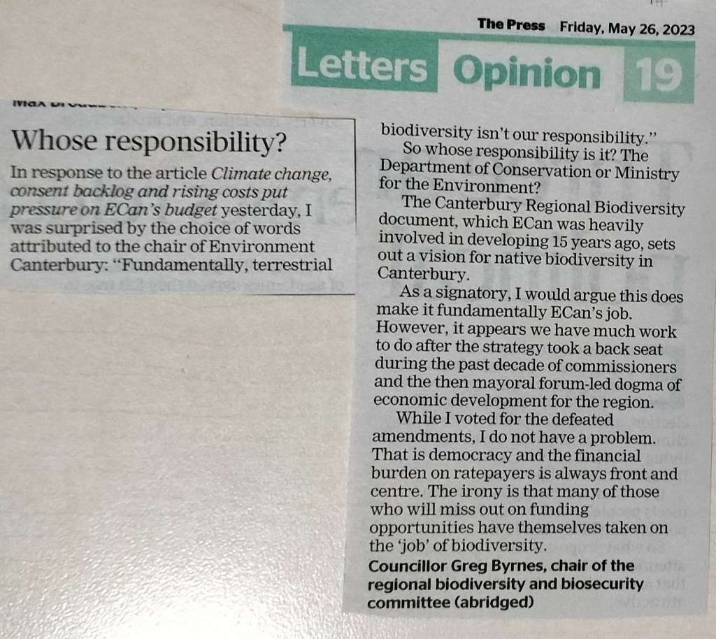I felt compelled, not only as a Councillor but as Chair of the Biodiversity & Biosecurity committee, to respond to the article in yesterdays The Press reporting the previous days Council meeting regarding the draft 23/24 draft annual plan.