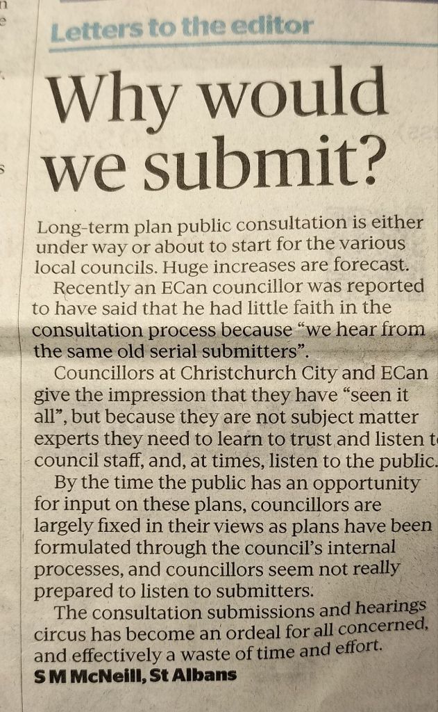 I can assure the letter writer and your readers that the comment attributed to one of my fellow ECan Councillors, in relation to the consultation process “we hear from the same old serial submitters’ does not in any way reflect my views.