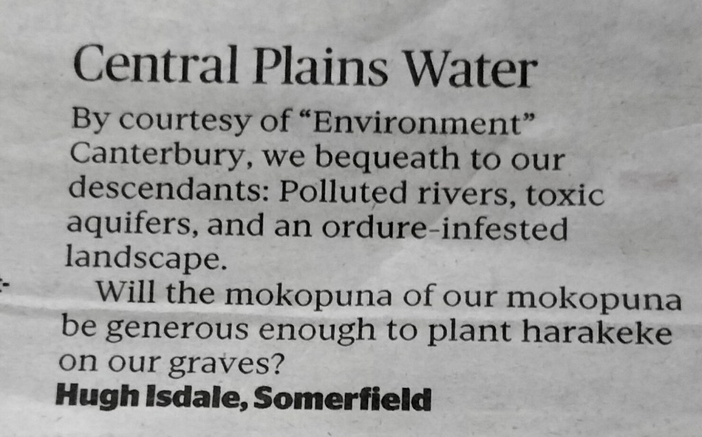 I can understand why Hugh has attributed this to Environment Canterbury, as the body vested with the task of developing and administering, among other things, the rules around extraction and discharge. Actions to appeal court decisions which place the wellbeing of the environment first and requesting Resource Management reform, provide little comfort and seem counter-productive to protecting the environment.