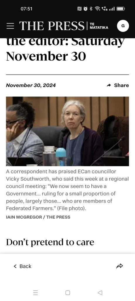 Spot on Vicky Southworth for ECan – Christchurch South-Ōwhanga Constituency calling it for what is…….begs the question why the labour party councillor voted with the rural, right block to delay for over a year